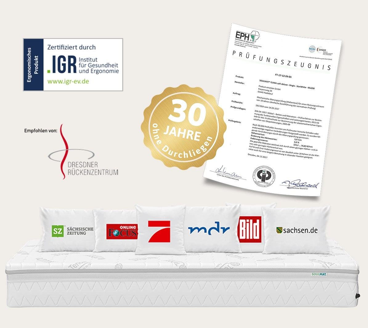 Das Hauptaugenmerk der SOULMAT liegt auf der Gesundheitsförderung während des Schlafs. Medizinische Schlafanalysen bestätigen eine signifikante Verbesserung der Schlafqualität durch die zahlreichen Self-Care-Eigenschaften der Matratze.